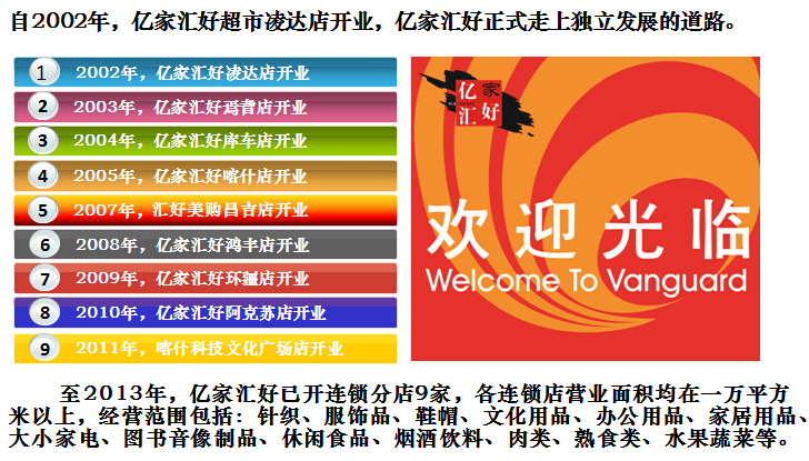 億家匯好商貿(mào)有限責任公司于2002年成立,并從臺灣引進連鎖經(jīng)營職業(yè)管理團隊,統(tǒng)一管理旗下各地的連鎖超市。公司通過多年的穩(wěn)健發(fā)展,至2013年底,億家匯好商貿(mào)有限責任公司已成為擁有員工近3000多人,下轄一個配送中心和9家連鎖超市的大型綜合性零售企業(yè)??偨?jīng)營面積11萬多平方米,配送中心輻射公司所有超市,年配送額可達2億元。公司大量吸納下崗職工,經(jīng)過崗前培訓(xùn),提高勞動技能,實現(xiàn)了他們的再就業(yè),為維護社會和諧穩(wěn)定做出了貢獻。2013年,巴州億家匯好商貿(mào)有限責任公司在自治區(qū)零售業(yè)中穩(wěn)踞前三位,是自治區(qū)重要的流通龍頭企業(yè),2013年年銷售收入達10億人民幣。多年來,公司一直重管理、抓實效、運用先進的管理手段和營銷理念,秉承億家匯好人 時時尋求效率創(chuàng)新,事事講究專業(yè)技術(shù)的文化精髓,創(chuàng)造了良好的經(jīng)濟效益和社會效益。公司先后多次被消費者協(xié)會評為誠信單位,并多年被評為重合同,守信用單位。